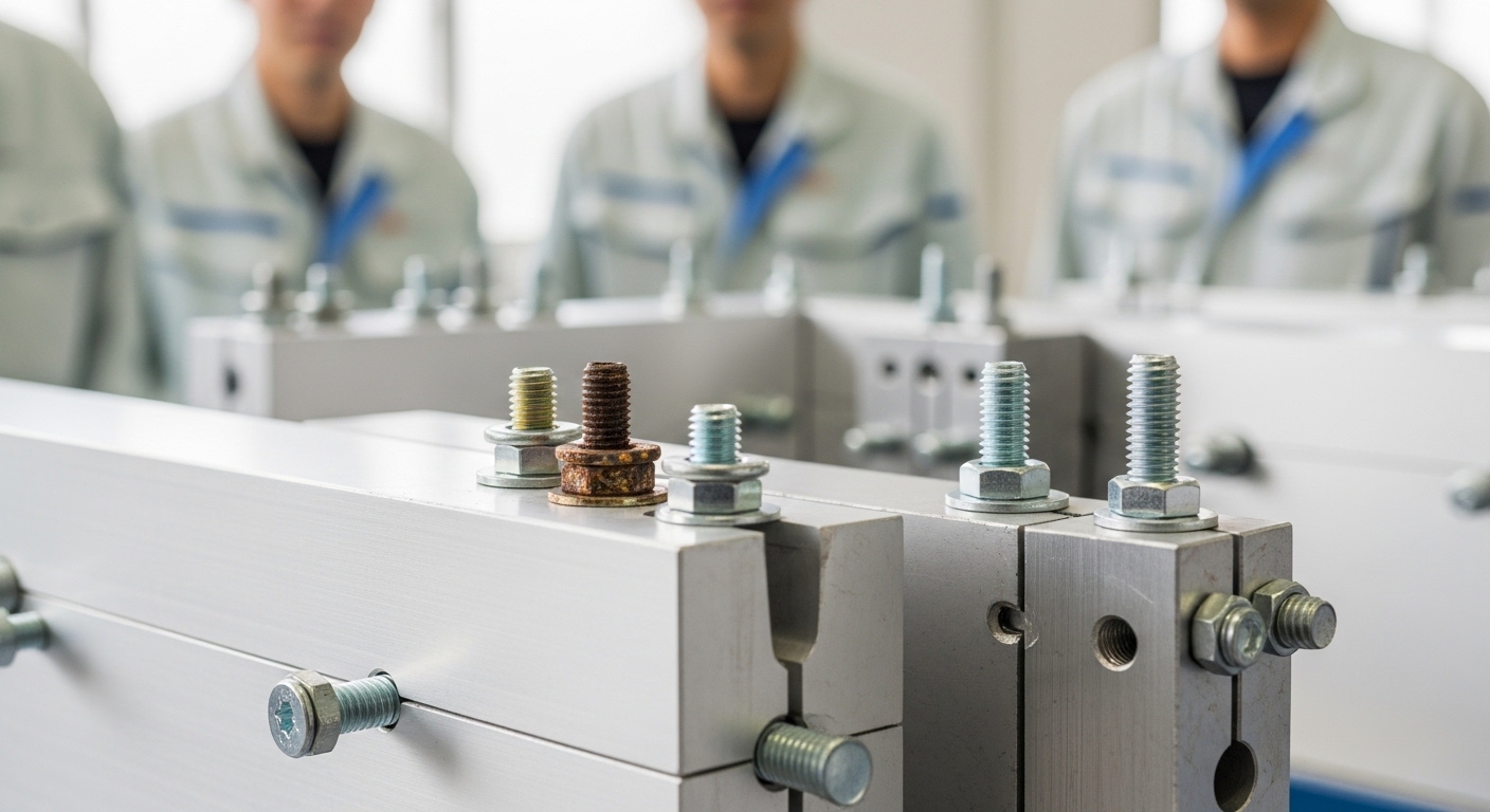 最も大事なのは、材質(アルミ×ネジ材)、表面処理(アルマイト・化成処理・防錆コーティング)、絶縁部品(樹脂ワッシャ・ブッシュ)、締付トルク設定をセットで検討することです。